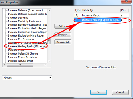 Item PropertiesIch wähle in der linken Tabelle die gewünschte Verzauberung und füge sie mit add zu. Unter Power stelle ich dann die Erhöhung entsprechend meiner Wünsche ein. Dabei sollte auf eine ausreichende Spielbalance geachtet werden.