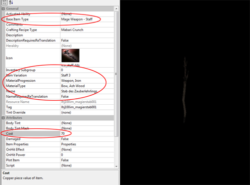 Unter Item Variation suche ich mir eine der passende Variation aus, ich wähle Staff 3 und wähle dann als MaterialProgression und -Type, Bow, Ash Wood aus. Als Namen gebe ich meinem Stab die Bezeichnung „Stab des Zauberlehrlings“ – dieser Name wird auch bei der Ausstattung angezeigt. Die Kosten (Cost) beziffere ich auf 70, der korrekte Wert wird von der Engine laut Wiki aufgrund des verwendeten Materials und Zustandes berechnet.