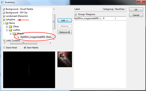 Nachdem ich das Item erstellt habe, rufe ich meine Waffenkiste auf (Doppelklick auf den Eintrag re. im Ressourcenfenster) und klicke im Eigenschaftsfenster auf Inventory List. In der Inventoryliste finde ich den Ordner Lehrjahre und hier meinen Stab. Ich wähle den Magierstab und füge ihn mit Add dem Inhalt der Kiste zu.