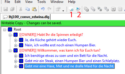 Man sieht eine Root (Wurzel), von der aus sich der Konversationbaum erstreckt. Mit Insert Line (1) wird eine neue Zeile des nächsten Gesprächspartners zugefügt, mit Insert Line After (2) eine weitere Zeile des gleichen Redners.