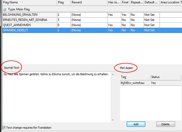 Für den Eintrag SPINNEN_GEKILLT wird unter Plot Assist durch Klick auf ADD der Tag auf lhj100cr_wirtsfrau und der Status auf YES gesetzt – Edwina erhält hierdurch nach Tötung der Spinnen wieder einen Doppelpfeil über dem Kopf zum Anzeigen, wo die Quest abgegeben werden kann.