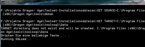 Wir drücken „Enter“ und warten ab. Der Vorgang dauert etwas – fasst euch also in Geduld und schließt das Fenster nicht. Am Ende wird erneut über das SQLCMD-Fenster das Drücken einer Taste gefordert. Drücken von „Enter„. Wichtig: Soll Spiel und Toolset an einer anderen Stelle installiert werden, bitte die txt-Datei benutzen, den Pfad des Installationsortes (Set Source und Set Target) entsprechend abändern und als bat-Datei abspeichern. Dann erst das Vorgehen wie beschrieben. - Es sollten sich unter dem Pfad „C:\Program Files (x86)\Dragon Age\tools\toolssql\Data“ zwei Einträge mit der Bezeichnung bw_dragonage_content.mdf und bw_dragonage_content.ldf befinden.