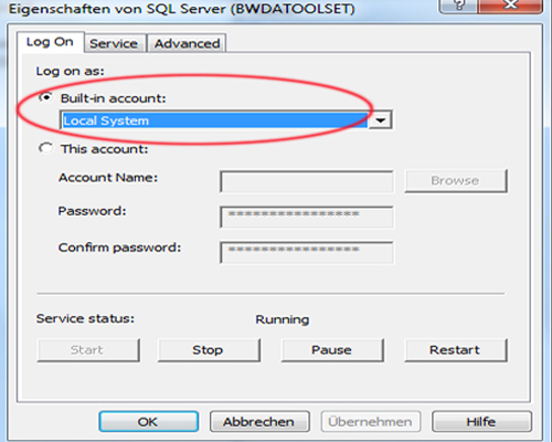 - Im jetzt erscheinenden Eigenschaftenfenster unter Build-in Account im DropDown Menü den Eintrag „Local System“ wählen und mit ok bestätigen. Das System arbeitet und teilt uns mit, dass der Server neu geladen wird. Wir bestätigen mit ok und warten den Ladevorgang ab und schließen erst danach alle Fenster.
